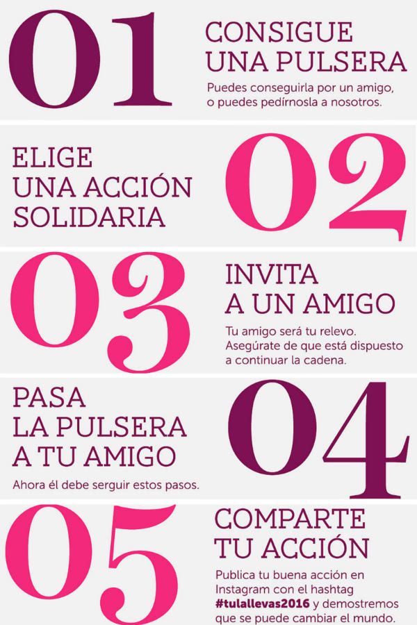 El lema con el que invitan a comenzar es toda una declaración de intenciones: «No queremos que tengas esta pulsera. Al menos no durante mucho tiempo. Ya no basta con comprar una pulserita para ser solidarios (es más, te la regalamos). Ha llegado el momento de pasar a la acción».