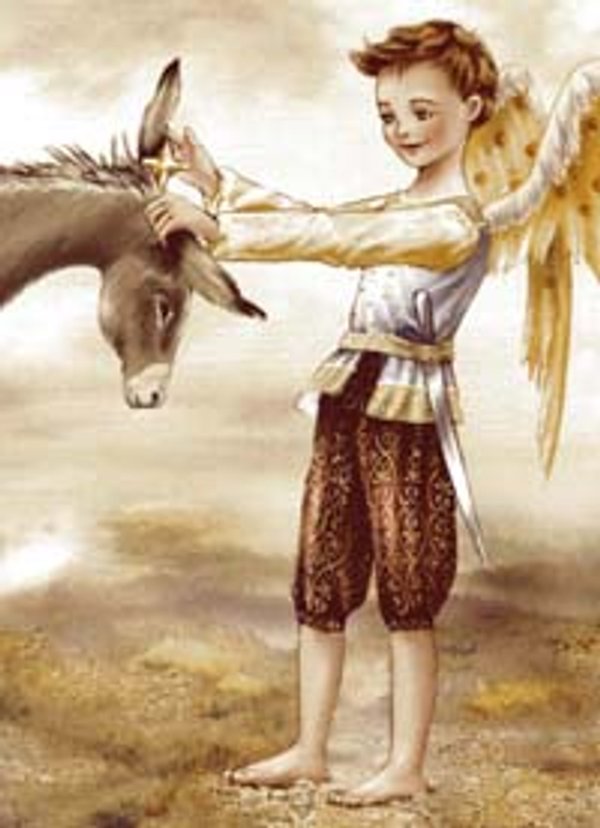 Preocupado, el Relojerico miraba al Cielo. No recordaba qué había dicho San Miguel sobre estos casos. Pero, al ver la sonrisa de la Virgen y de doña Dolores, que siempre terminaba enterándose, el angelito volvía complacido su mirada a Josemaría, quien feliz saboreaba sus dos golosinas. "Vida y venturas de un borrico de noria... y su Relojerico". Ed. Palabra. Texto e ilustraciones: Paulina Mönckeberg, 2004