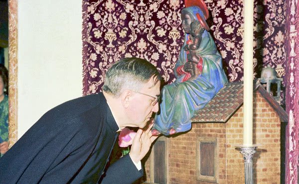 San Josemaría besa una imagen que representa a la Virgen de Loreto.