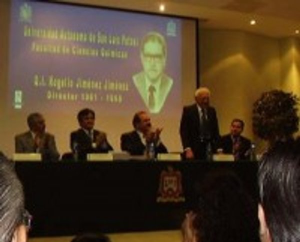 Rogelio Jiménez Jiménez, Químico Industrial, fue profesor durante muchos años en la Escuela de Ciencias Químicas de la Universidad Autónoma de San Luis Potosí. En los años sesenta fue también Director, pero lo que movió a muchos exalumnos suyos a solicitar que el nuevo auditorio llevara su nombre fue su labor docente y su dedicación a los alumnos, de quienes casi diariamente recibía visitas en su casa para continuar las conversaciones iniciadas en las aulas.