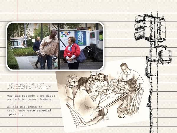 Le enseñé el rosario, que iba rezando. Al verlo, comentó: “yo también tener. Mañana…” Y al día siguiente vino con varios rosarios porque también los vendía. Me regaló uno y desde entonces lo llevo en el coche. Yo le di una estampa de San Josemaría: “Este es un santo muy bueno que te va a ayudar. Tú llévala siempre“.