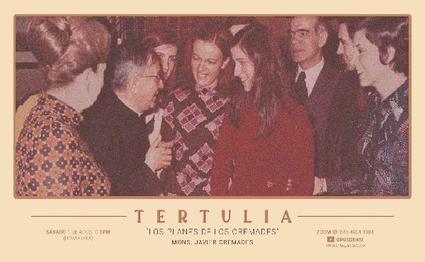 El próximo 1 de agosto a las 13:00 hrs (Centro de México) se llevará a cabo una tertulia con Mons. Javier Cremades sobre el libro "Los planes de los Cremades: una familia amiga de san Josemaría" el libro puede comprarse en Lulú o descargarse en Bubok en formato Epub.