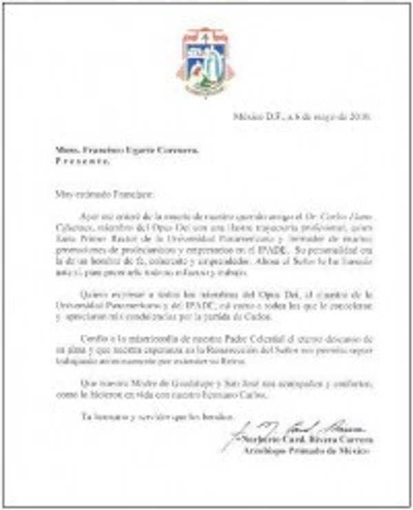 Quiero expresar a todos los miembros del Opus Dei, al claustro de la Universidad Panamericana y del IPADE, así como a todos los que le conocieron y apreciaron, mis condolencias por la partida de Carlos.