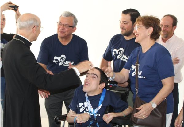 Antes de entrar, el Padre se ha detenido un momento para saludar a Gerardo S, un muchachos de San Rafael en silla de ruedas. Gerardo le ha dado una estampa de san Oscar Romero al Padre. También el Padre ha saludado a otro chico en silla de ruedas, de Chile.