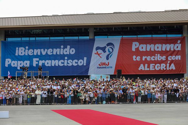 En las gradas del público (2,500 espacios habilitados) había letreros dándole la bienvenida al sucesor de Pedro: “Papa Francisco esta es tu casa, bienvenido”, “¡Bienvenido a Panamá, Papa Francisco!”. No faltaron las banderas panameñas, las del Vaticano y de otros países de Latinoamérica.