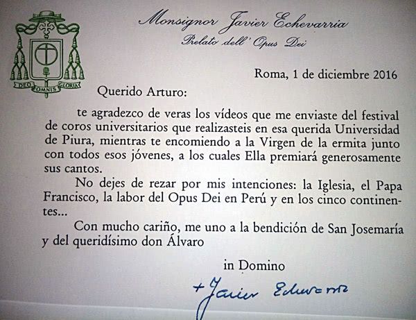 Cuál sería nuestra sorpresa, la del maestro Hernández que quiso compartir inmediatamente con los chicos del Coro, cuando poco antes de la Navidad recibió una carta de Mons. Javier Echevarría, fechada el 1 de diciembre de 2016 (Roma), cuatro días antes de ser internado en la clínica, donde estuvo sus últimos días. La queremos reproducir aquí, por el especial valor que adquiere después de su fallecimiento: