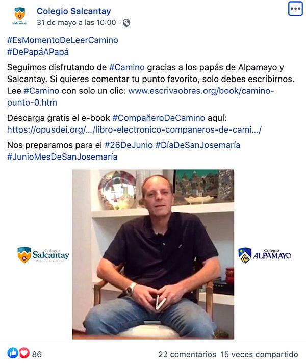 Inmediatamente, en Alpamayo y Salcantay trabajamos en equipo. Junto con Renzo Forlín y Pilar García, nuestros directores y Walter Espinoza y Lichi Alayza, nuestros directores de Formación, concretamos la idea. Conversaríamos con los grupos de padres quienes ya se reúnen según sus propios intereses. Apenas lo hicimos, la respuesta fue inmediata. Cada uno leería un punto de Camino, el que quisiera, y lo comentaría. Habíamos encontrado quién podría y cómo podría ayudarnos. Les pedimos que el video fuera corto y concreto. El guión sobraba. Era necesaria la libertad que tanto le gustaba a San Josemaría. Es así que empezamos publicando dos videos a la semana en nuestras redes sociales. Rápidamente la idea empezó a gustar. Nos preguntaban cómo participar.