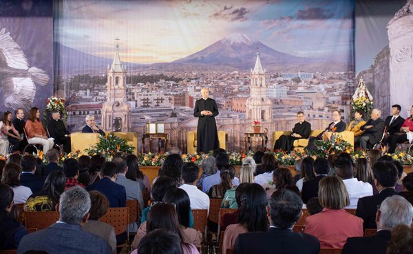 A las 12:00 m. monseñor Ocáriz se encontraba con familias enteras y jóvenes que acudieron a verle al Centro de Convenciones del Club del Colegio de Abogados. Entre el público había personas procedentes de Tacna, ciudad fronteriza con Chile, y de Cusco, a 500 Km de distancia a través de los Andes. El estrado tenía como fondo una imagen de la catedral de Arequipa, construida en el siglo XVII, con el volcán Misti detrás y había una imagen de la Virgen de Chapi, patrona de Arequipa.