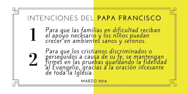 La intención universal del apostolado de la oración del Santo Padre para el mes de marzo de 2016 es: ”Para que las familias en dificultad reciban el apoyo necesario y los niños puedan crecer en ambientes sanos y serenos”.