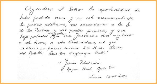 “Agradezco al Señor la oportunidad de haber podido rezar y ver este monumento de la piedad cristiana, me encomiendo a la fe de los Pastores y del pueblo peruano, y me hago portador de cariño que San Josemaría tuvo –y tiene- a esta tierra, a esta arquidiócesis, al que se asoció su primer sucesor S. E. Mons. Álvaro del Portillo. Leus Deo, Virginique Matri!