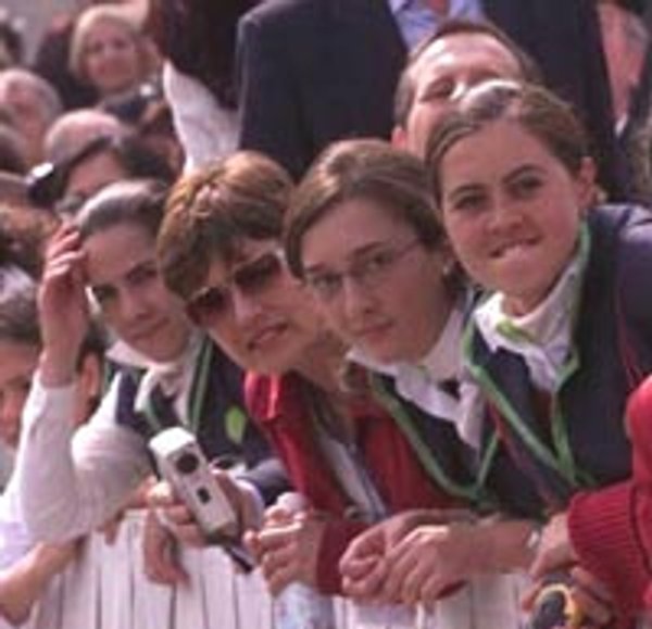 Un grupo de personas que mira con expectación cómo Juan Pablo II se acerca en el Papa-móvil, un voluntario que explica a unos peregrinos el modo de llegar a su sitio en la plaza, miles de paraguas blancos que se despliegan en el momento de la comunión, rostros sonrientes, gente rezando: una sucesión de 80 instantáneas ofrece un grato recuerdo de aquellas jornadas romanas.