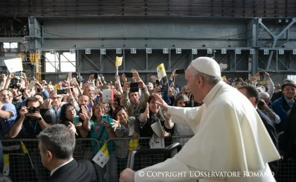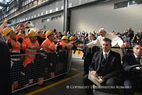 He aceptado la propuesta de tener este encuentro hoy, en un lugar de trabajo y de trabajadores, porque también estos son lugares del pueblo de Dios. Los diálogos en los lugares de trabajo no son menos importantes que los diálogos que hagamos en las parroquias o en las solemnes salas de convenciones, porque los lugares de la Iglesia son los lugares de la vida y, por tanto, también las plazas y las fábricas. Porque alguno puede decir: “¿Pero este cura qué viene a decirnos? ¡Que se vaya a su parroquia!”. No, el mundo del trabajo es el mundo del pueblo de Dios: somos todos Iglesia, todos pueblo de Dios. Muchos de los encuentros entre Dios y los hombres, de los que nos hablan la Biblia y los Evangelios, sucedieron mientras las personas trabajaban: Moisés oye la voz de Dios que lo llama y le revela su nombre mientras apacentaba el rebaño del suegro; los primeros discípulos de Jesús eran pescadores y son llamados por Él mientras trabajaban a la orilla del lago. Es muy cierto lo que Él dice: la falta de trabajo es mucho más que el mero agotarse de una fuente de ingresos para poder vivir. El trabajo es también eso, pero es mucho, mucho más. Trabajando somos más persona, nuestra humanidad florece, los jóvenes se vuelven adultos solo trabajando.