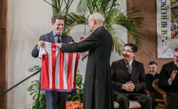 Laguna Grande generó un momento especial: le regalaron una camiseta del colegio y le dieron a tomar tereré —bebida tradicional del país— con la misma guampa que había tomado el Papa Francisco, como acreditaba una foto que presentaron como prueba.