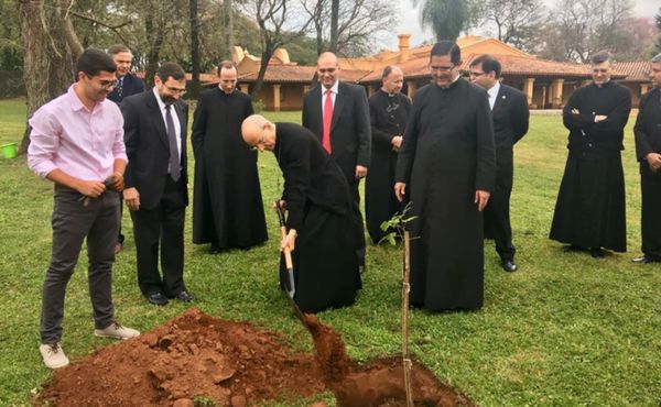 El Prelado pasó a conocer las instalaciones de la nueva sede del colegio Buenafuente, anexa a La Cumbrera. Aunque el día estuvo nublado y lloviznaba, caminó entusiasmado en medio del barro y hasta plantó un árbol ayudado por Koki, fiel colaborador de Buenafuente.