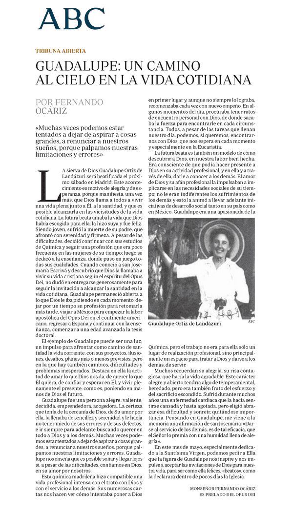 La sierva de Dios Guadalupe Ortiz de Landázuri será beatificada el próximo 18 de mayo en Madrid. Este acontecimiento es motivo de alegría y de esperanza, porque manifiesta, una vez más, que Dios llama a todos a vivir una vida plena junto a Él, a la santidad, y que es posible alcanzarla en las vicisitudes de la vida cotidiana.