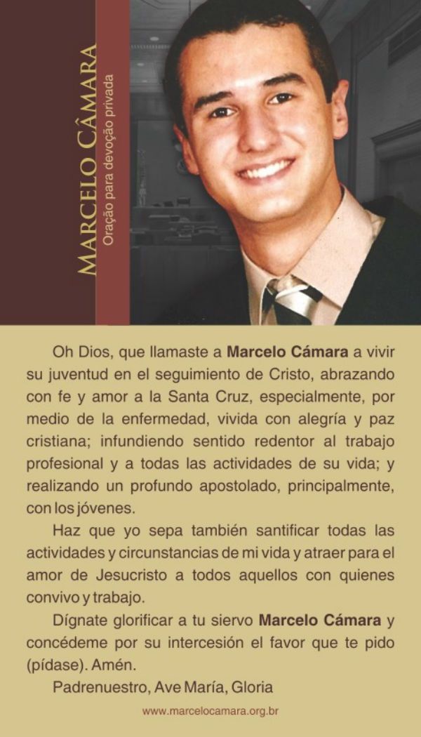 Oh Dios, que llamaste a Marcelo Cámara a vivir su juventud en el seguimiento de Cristo, abrazando con fe y amor a la Santa Cruz, especialmente, por medio de la enfermedad, vivida con alegría y paz cristiana; infundiendo sentido redentor al trabajo profesional y a todas las actividades de su vida; y realizando un profundo apostolado, principalmente con los jóvenes.