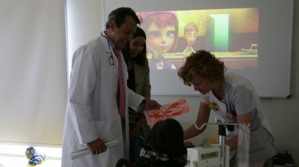 Están proyectando la película de dibujos Kung Fu Panda y cada niño la está viendo, a su manera, mientras las enfermeras y las fisioterapeutas les aplican su medicación, les dan masajes y les estimulan con canciones.