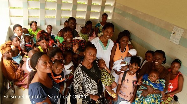 Grupo de mujeres con sus hijos en una de las antenas médicas del Hospital Monkole./ Imagen cedida por ONAY