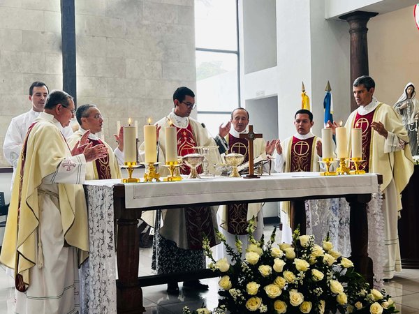 En su homilía, el padre René Parada hizo un breve recorrido por la vida de Javier: sus años en el Colegio Lamatepec, sus estudios de Ingeniería Industrial en la Universidad Centroamericana José Simeón Cañas (UCA), su labor docente en Lamatepec, su experiencia en la industria de soluciones de empaque en Soyapango y, finalmente, su viaje a Roma en 2018 para continuar estudios que culminaron con su ordenación sacerdotal en 2024.