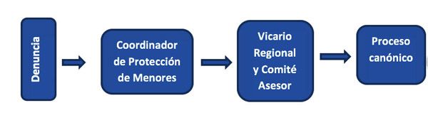 Las denuncias se presentan al Coordinador de protección de menores. Esta persona contacta al denunciante, recibe el relato de la denuncia, levanta un acta y la pone en conocimiento del Vicario regional, quien, si procede, decreta el inicio del proceso canónico. Para tomar esta decisión el Vicario cuenta con la asesoría de un Comité compuesto de profesionales del área del derecho y la salud.