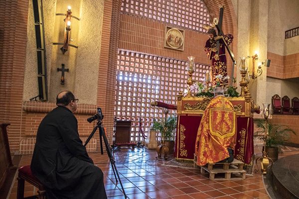 No solamente se ha celebrado la misa diaria. Por ser tiempo de Cuaresma, la Iglesia continúa con sus actividades regulares como: la exposición del Santísimo, meditación y el Viacrucis; aunque con algunas variaciones para ajustarse a la transmisión por Instagram. Acá usamos unas paletas de carga para levantar al padre y que la toma de la transmisión fuera adecuada.