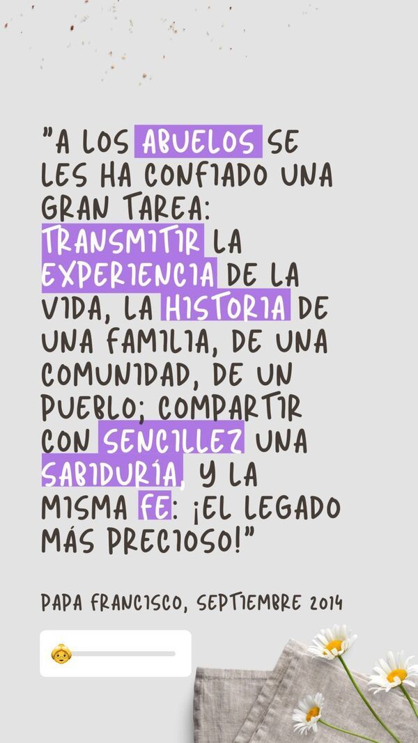 No importa la edad que tengas, si sigues trabajando o no, si estás solo o tienes una familia, si te convertiste en abuela o abuelo de joven o de mayor, si sigues siendo independiente o necesitas ayuda, porque no hay edad en la que puedas retirarte de la tarea de anunciar el Evangelio, de la tarea de transmitir las tradiciones a los nietos. Es necesario ponerse en marcha y, sobre todo, salir de uno mismo para emprender algo nuevo.
