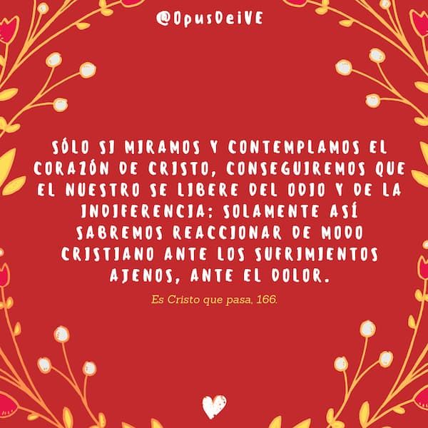 Especialmente, en estos momentos, recomiendo acudir al corazón de Cristo, en el «...encuentra paz quien está angustiado por las penas de la existencia; encuentra alivio quien se ve afligido por el sufrimiento y la enfermedad; siente alegría quien se ve oprimido por la incertidumbre y la angustia, porque el corazón de Cristo es abismo de consuelo y de amor para quien recurre a Él con confianza». (Audiencia general. Julio de 2003. Miércoles 2 de julio de 2003 Discurso a los alumnos del Seminario Romano Mayor. Marzo 2003).