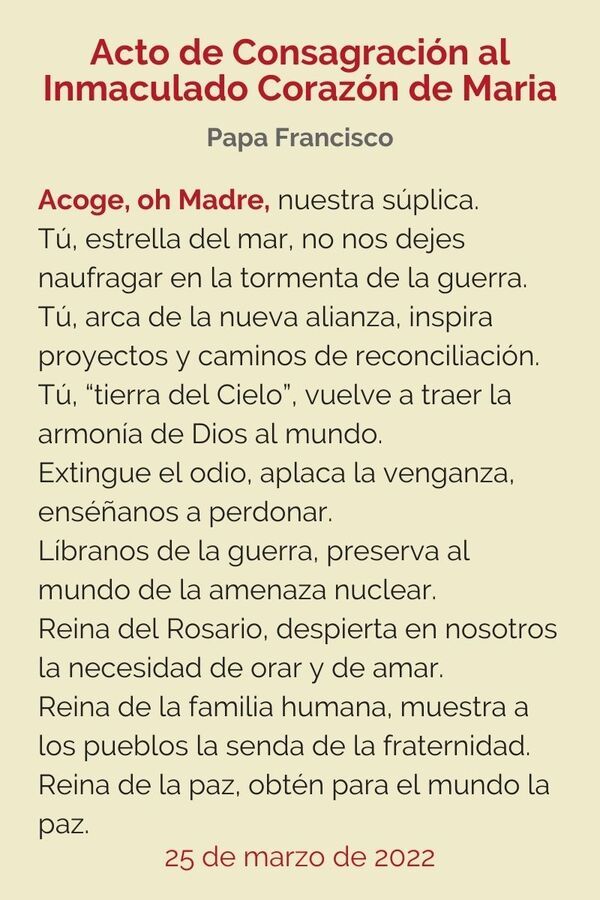 Por eso, Madre de Dios y nuestra, nosotros solemnemente encomendamos y consagramos a tu Corazón inmaculado nuestras personas, la Iglesia y la humanidad entera, de manera especial Rusia y Ucrania. Acoge este acto nuestro que realizamos con confianza y amor, haz que cese la guerra, provee al mundo de paz. El “sí” que brotó de tu Corazón abrió las puertas de la historia al Príncipe de la paz; confiamos que, por medio de tu Corazón, la paz llegará. A ti, pues, te consagramos el futuro de toda la familia humana, las necesidades y las aspiraciones de los pueblos, las angustias y las esperanzas del mundo.