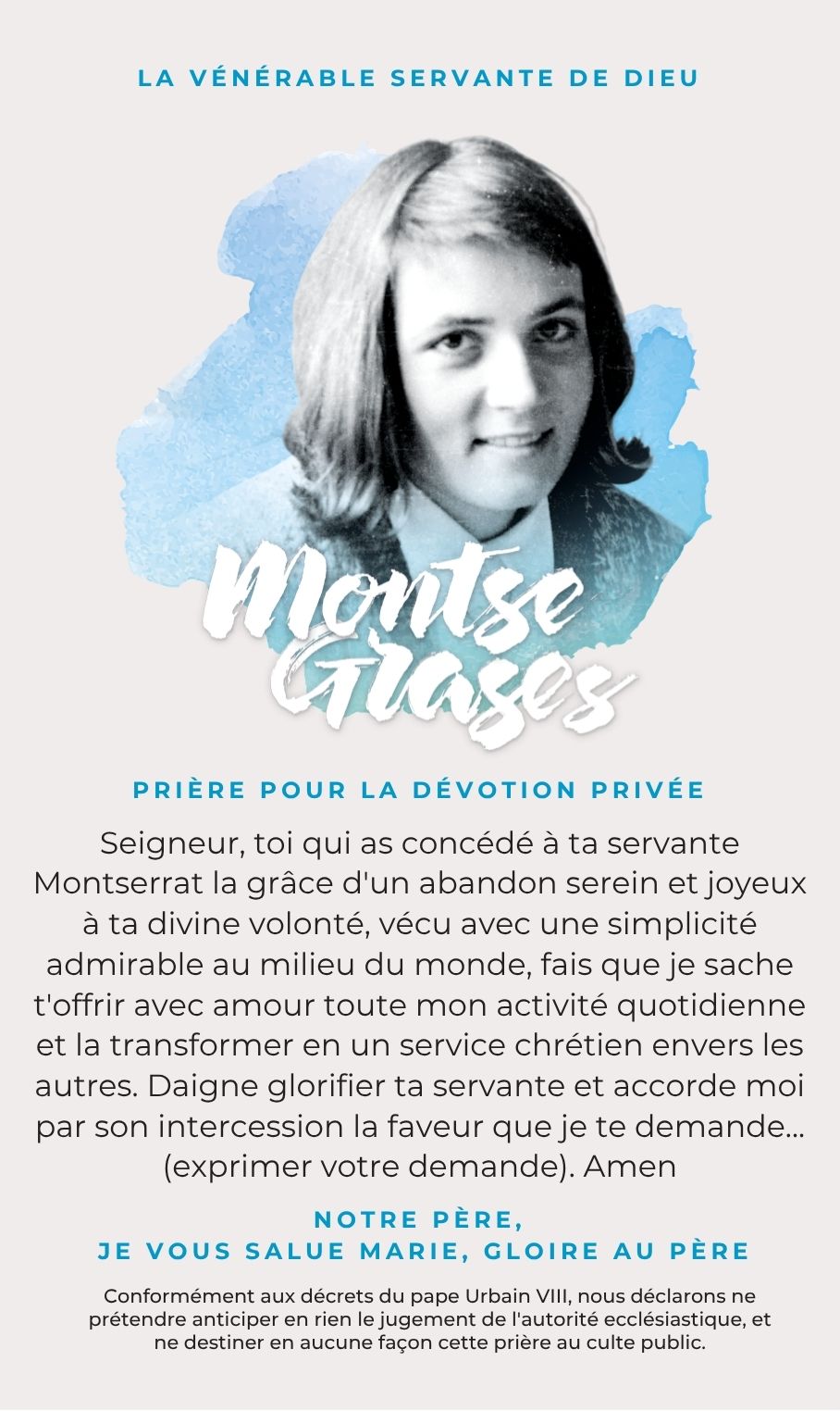 Nous serions reconnaissants à toute personne ayant obtenu des grâces par l’intercession de Montserrat Grases d’en faire part au Bureau pour les Causes des saints de la Prélature de l’Opus Dei en France, 7, rue Dufrénoy 75116 Paris. E-mail : ocs.fr@opusdei.org