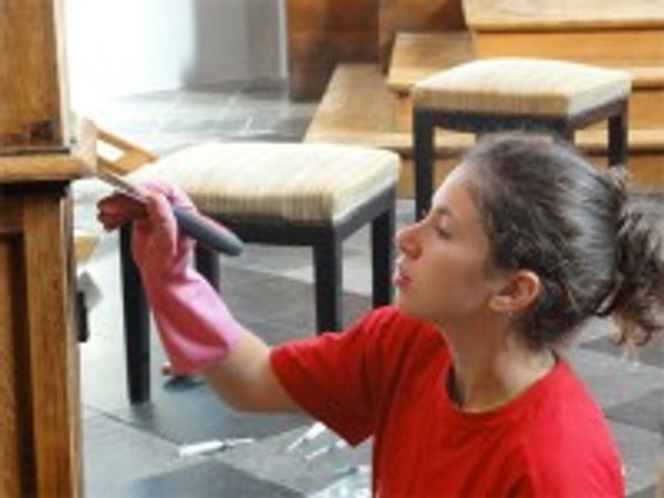 Sophie était le chef de l’équipe « décapage » de l’autel latéral. Son équipe a eu besoin de persévérance et d’énergie : « L’autel doit être terminé avant le mariage de samedi… pas de pause aujourd’hui! ». Le groupe « chaises », dirigé par Lena, s’occupait de sélectionner les chaises en bon état et de les traiter avec un produit contre les vers avant de les vernir.