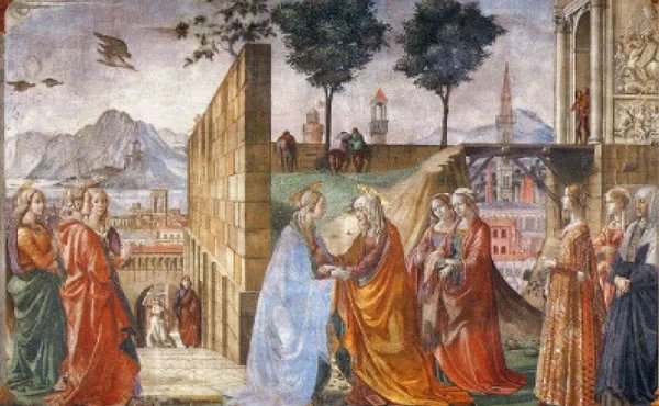 On salue la personne que son voyage a fatiguée, mais ici c’est Marie qui salue Élisabeth. Elle la serre dans ses bras, la félicite, lui promet d’être à ses côtés. Avec Elle, c’est la grâce du Seigneur qui entre dans cette maison, car Dieu a fait d’Elle sa médiatrice. Son arrivée a causé une révolution spirituelle. Lorsque Élisabeth entendit la salutation de Marie - raconte Saint Luc- l’enfant tressaillit dans son sein, et Élisabeth fut remplie de l’Esprit Saint (Lc 1, 41).