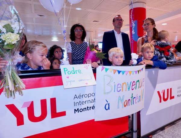 Le prélat est arrivé à Montréal en avion le 15 août, jour de la fête de l’Assomption de la Sainte Vierge, vers 17 h. Des familles de la région de Montréal étaient là pour l’accueillir à son arrivée, Charmaine, Mathew et leurs enfants ainsi que Michelle, Alexandre avec cinq de leurs enfants. Ils lui ont offert des fleurs et avaient des banderoles lui souhaitant la bienvenue à Montréal et un joyeux anniversaire, accompagnées de ballons portant le numéro 48 en l’honneur du 48e anniversaire de son ordination sacerdotale. Ils ont apporté une guirlande aux motifs canadiens.