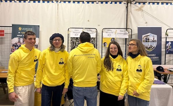 Très vite, l’équipe se met en mouvement. Conseils pris à l’étranger, soutien reçu, idées échangées… mais surtout, une ligne directrice claire. « Nous nous sommes inscrits dans une perspective de semeur : que voulions-nous semer ? » Le stand ne sera pas seulement informatif : il sera vivant, accueillant, joyeux. On y distribue des phrases de saint Josémaria, tirées au hasard dans une corbeille, des livres, des médailles… mais aussi, plus simplement, des gâteaux ou une bière à l’heure de l’apéritif. Des sweats jaunes, visibles de loin, donnent le ton : ici, on parle de joie. « Nous voulions attirer, être généreux, transmettre la joie de saint Josémaria et son amour pour la liberté. » Pendant tout le week-end, l’équipe se relaie : jeunes, couples, personnes plus âgées. Une diversité qui dit déjà quelque chose du message qu’ils viennent partager.