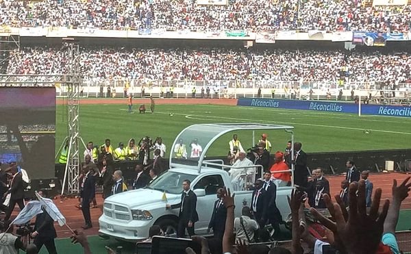 Après une nuit de veillée et d'attente à l'aérodrome de Ndolo, le Pape est arrivé et la papamobile a fait un tour pour lui permettre de saluer les participants à la Messe. Tout le monde chantait, dansait, remuait les bras et les drapelets en guise de salutation. On voyait le Pape François saluer tout ce monde avec un sourire, visiblement très content de voir ces Congolais heureux.