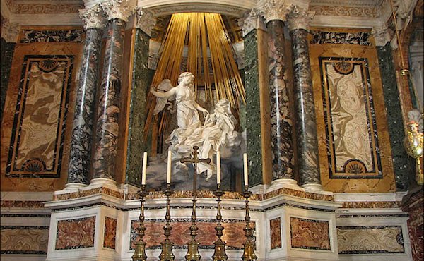 Les artistes se sont inspirés du récit ; trente ans après la canonisation de la carmélite, le Bernin atteignit un sommet avec sa sculpture : à l’église Santa Maria della Vittoria (Rome, 1652), L’extase de Sainte Thérèse trône dans la chapelle Cornaro, de pur style baroque. Le chœur déborde de marbres polychromes, de métal doré et d’effets visuels. La lumière descend du haut, comme un don de l’Esprit Saint ; la coupole suggère une foule de chérubins célestes. Thérèse, ravie, se tient affaissée, les yeux clos, la bouche entre-ouverte.
