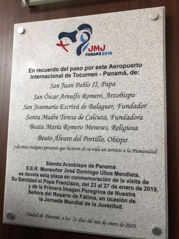 Voici le texte : "En mémoire du passage par cet aéroport international de Tocumen - Panama, de : Saint Jean Paul II, Pape ; Saint Oscar Arnulfo Romero, Archevêque ; Saint Josémaria Escriva de Balaguer, Fondateur ; Mère Teresa de Calcutta, Fondatrice ; Bienheureuse Maria Romero Meneses, religieuse ; Bienheureux Alvaro del Portillo, et d'autres personnes remarquables qui ont vécu au service de l'humanité"