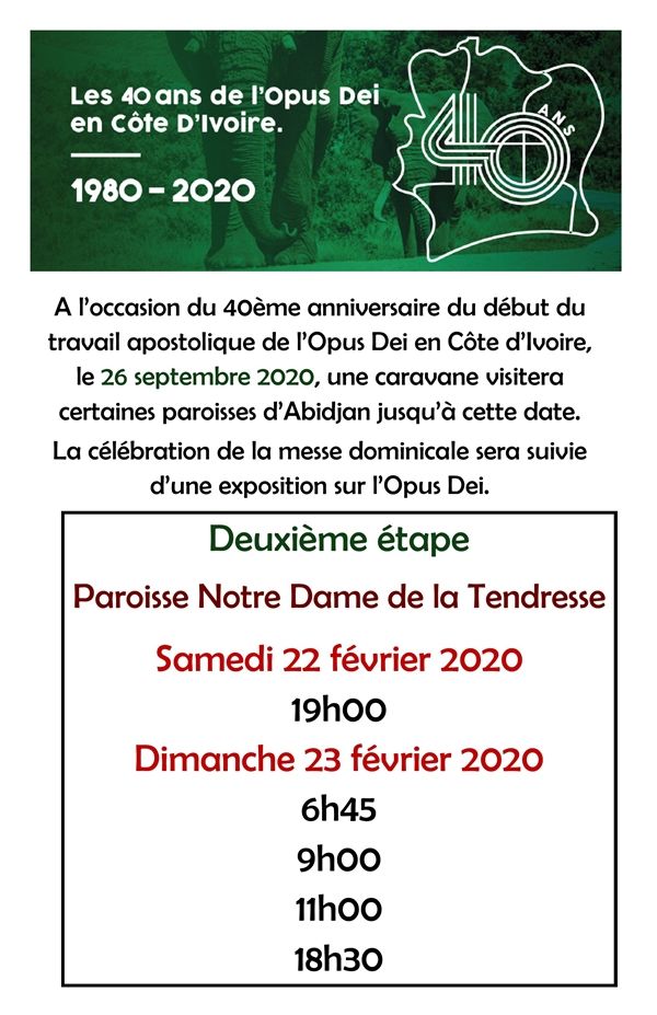 Présent pour le lancement de cette caravane, l’abbé Sissoko, vicaire régional de l’Opus Dei en Côte d’Ivoire a rappelé le choix de Saint Jacques pour 1ère étape : c’est sur le territoire de cette paroisse que se trouve le siège de l’Opus Dei en Côte d’Ivoire. C’est aussi sur ce même territoire que les premiers membres de l’Opus Dei arrivés en 1980 ont habité. C’est dans l’église paroissiale d’alors que s’est célébrée la première messe du 26 juin, en 1981.