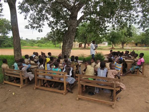L’appui scolaire a été apporté à plus de 200 écoliers. À la tâche, il y avait Félix, Isidore et Pacôme, trois étudiants devenus enseignants pour la circonstance. Chacun avait à sa charge des élèves de 2 classes regroupés par niveau (Cours Préparatoire, Cours Élémentaire et Cours Moyen). Les « salles » de classe étaient franchement atypiques. Quand on y « entrait » on se rendait compte que les élèves avaient de la voix et étaient très disciplinés. Ils accueillaient avec leur fameuse récitation « bonjour …me tais ». La salle, n’avait pas de porte, encore moins des fenêtres. Assis à trois ou quatre par banc, les élèves pouvaient au moins profiter de l’air frais, en suivant les cours. En effet, l’appui scolaire se déroulait à l’air libre, à l’ombre des manguiers plantés dans la cour de l’école. Malgré tout, le sérieux ne manquait pas aux enseignants et encore moins aux apprenants, même si quelques fois ces derniers ne pouvaient s’empêcher de s’exprimer en baoulé (langue de la région) au lieu du français. Les cours finis, en rentrant, ces écoliers pouvaient apprécier l’avancement des travaux de leur école.