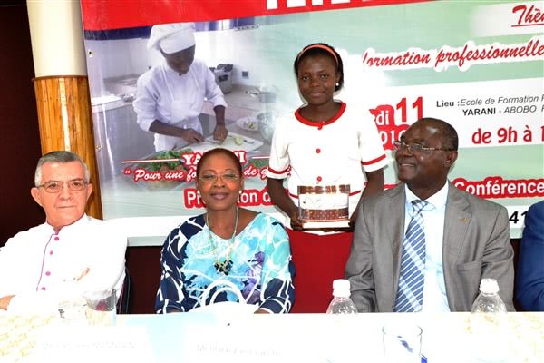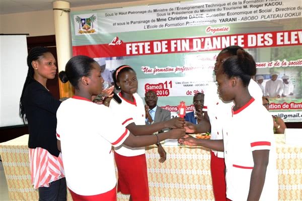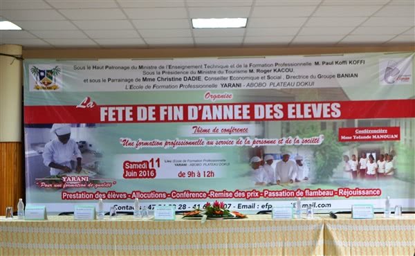 Le samedi 11 juin 2016, à l’Ecole de Formation Professionnelle Yarani, s’est déroulée la fête de fin d’année des élèves. Une cérémonie haute en couleurs qui commémore les 25 ans de l’établissement et qui a été placée sous le haut patronage du Ministre de l’Enseignement Technique et de la Formation Professionnelle, représenté par Mme Kouamé Huguette, Directrice de la Promotion de la Formation Privée, et sous la présidence du Ministre du Tourisme, représenté par M. Konaté Laurent, Conseiller technique. Mme Christine DADIE, Directrice des restaurants Banian et Conseiller technique, a été la marraine de la cérémonie. Etait également présent à cette cérémonie, le Vicaire Régional de la Prélature de l’Opus Dei en Côte d’Ivoire, Mgr François Sanchez.