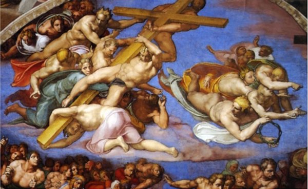 Au centre de la représentation du Jugement dernier de la Chapelle Sixtine, chef-d’œuvre de Michel Ange, nous voyons le Christ qui, d’un mouvement de son bras, semble gouverner l’univers. À côté de lui, Sainte Marie regarde avec pitié ses enfants alors qu’ils se présentent devant le Juge suprême. Une multitude de personnages entoure ces deux figures : saints de l’Ancien et du Nouveau Testament, martyrs et apôtres, qui contemplent le Sauveur.