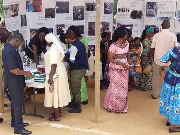 Après quelques imprévus au moment du départ, indépendants de notre volonté, nous arrivons à Nsimalen au sortir de la messe de 6h. Nous installons notre matériel: des panneaux bien en vue et très expressifs relatant la vie de saint Josémaria, de sa tendre enfance jusqu’à sa mort, et présentant ses successeurs jusqu'au prélat actuel. Nous attendons patiemment la fin de la seconde messe qui a commencé à 8h. Notre présence en ces lieux a été annoncée par le célébrant.