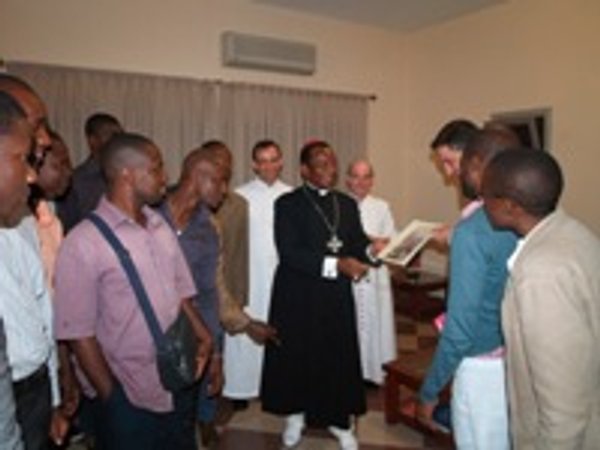 Avant de parler aux étudiants l’archevêque a voulu écouter leurs témoignages, qui ont été nombreux. Quelques uns lui ont expliqué les différentes activités qu’on développe dans le Centre : par exemple, Steve, étudiant de Mathématiques á l’Ecole Normal, lui a raconté l’importance que le Centre donne à l’étude bien fait, en suivant l’esprit de Saint Josemaria Escriva, fondateur de l’Opus Dei. Cyrille, étudiant en Physiques á l’Université de Yaoundé I, a parlé du Club Solidarité dont son objectif est de faire des visites aux malades et démunis de la ville. Marius, étudiant en Droit à l’Université de Yaoundé II lui a expliqué les pèlerinages qu’on a faits au Centre en honneur de la Vierge durant le mois de Mai.