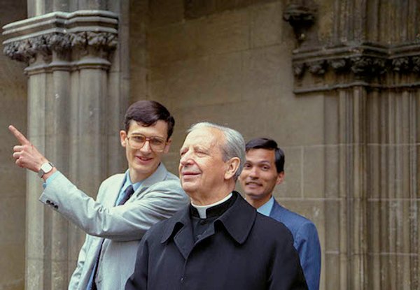 Vers la fin des années 1980 j’étais l’un des collaborateurs du Vicaire de l’Opus Dei pour la France, Mgr Augustin Roméro, appelé par la suite par le cardinal archevêque de Paris à remplir les fonctions de Vicaire judiciaire pendant de longues années. Il y avait là des gens formidables, je ne citerais que le souvenir de François-Xavier Guerra, qui désormais se consacrait déjà à temps plein à son enseignement en Sorbonne et qu’un cancer emporterait en 2002 : historien doté d’une étonnante puissance spéculative, c’était un esprit libre, totalement habité par la charité. L’ambiance était simple et joyeuse, et les balivernes qu’on entendait parfois sur l’Opus Dei prêtaient à sourire : nous cédions facilement à la galéjade, comme on dit dans ma Provence natale. Insouciance ? Confiance dans la Providence ? Don Alvaro, que nous appelions familièrement « Père », logeait évidemment chez nous lorsqu’il venait nous voir ou qu’il passait par Paris, par exemple lors de voyages aux États-Unis ou en Allemagne. Je me souviens qu’un après-midi nous lui avons remis Le Monde et Le Figaro, qu’il remercia avec un sourire : « Pourquoi deux quotidiens ? Un seul me suffit ! » C’était pour lui, je pense, une manière de profiter du temps et, dans son cas, de se contenter du nécessaire. Mais ce qui me frappait le plus c’était son humilité.