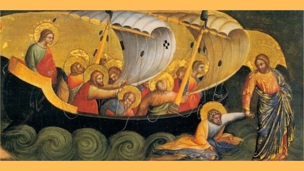 L’Évangile nous dit, cependant, que dans l’aventure de ce voyage difficile, nous ne sommes pas seuls. Le Seigneur, presqu’en forçant l’aurore au cœur de la nuit, marche sur les eaux agitées et rejoint les disciples, il invite Pierre à venir à sa rencontre sur les vagues, il le sauve quand il le voit s’enfoncer, et enfin, il monte dans la barque et fait cesser le vent.