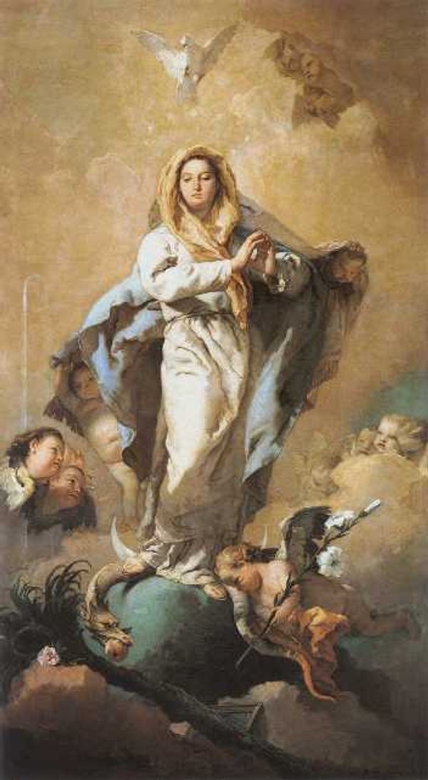 Un grand signe apparut dans le ciel : une femme avec une couronne de douze étoiles sur la tête. — Revêtue du soleil. — La lune à ses pieds. (Ap 12, 1). Marie, Vierge sans tache, a réparé la chute d'Eve: et elle écrase de son talon immaculé la tête du serpent infernal. Fille de Dieu, Mère de Dieu, Epouse de Dieu.