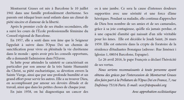 Seigneur, toi qui as concédé à ta servante Montserrat la grâce d'un don serein et joyeux à ta divine volonté, vécu avec une simplicité admirable au milieu du monde, fais que je sache t'offrir avec amour toute mon activité quotidienne et la transformer en un service chrétien des autres.