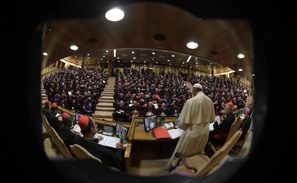 C’est pourquoi je ne peux pas commencer sans vous dire merci ! Merci à vous qui êtes présents, merci à toutes les personnes qui, au long d’un chemin de préparation de deux années, – ici dans l’Église de Rome et dans toutes les Églises du monde – ont travaillé avec dévouement et passion pour nous permettre de parvenir à ce moment. Merci infiniment au Cardinal Lorenzo Baldisseri, Secrétaire général du Synode, aux Présidents délégués, au Cardinal Sergio da Rocha, Rapporteur général, à Mgr Fabio Fabene, Sous-Secrétaire, aux officials du Secrétariat général et aux assistants ; merci à vous tous, Pères synodaux, auditeurs, auditrices, experts et consulteurs ; aux Délégués fraternels ; aux traducteurs, aux choristes, aux journalistes. Merci infiniment à tous pour votre participation active et féconde.