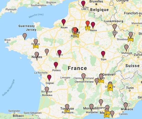 Carte des villes de France dans lesquelles on trouve un centre de l'Opus Dei, ou des activités de formations organisées par la Prélature