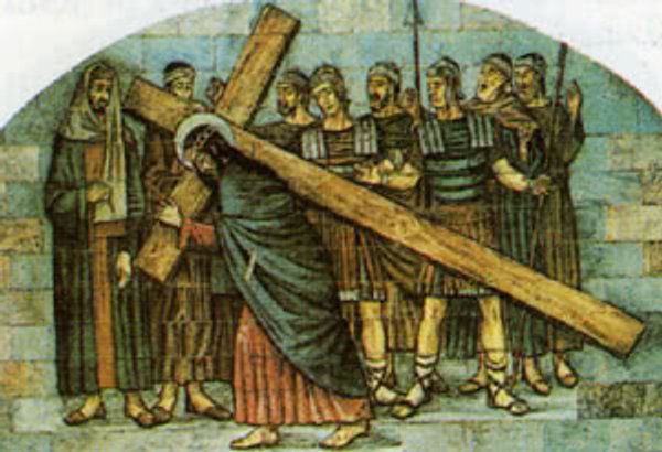 Portant lui-même sa Croix, il marche vers le Calvaire, ce lieu dit Golgotha en hébreu (Jn 19, 17). — Et ils réquisitionnent un certain Simon de Cyrène, qui revient d'une ferme, et le chargent de la Croix pour la porter derrière Jésus (Lc 23, 26).