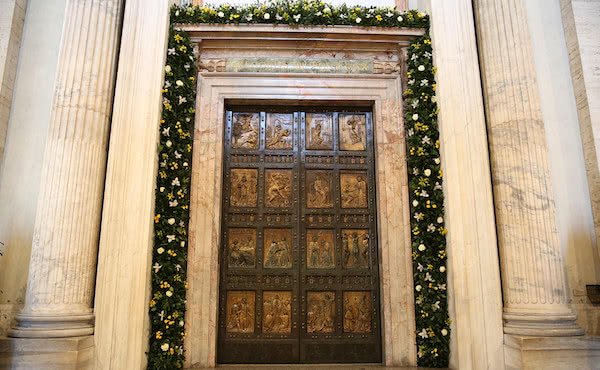 Frères et sœurs, arrivés au seuil du Jubilé, devant nous se tient la grande porte de la Miséricorde de Dieu qui accueille notre repentir et nous offre la grâce de son pardon. Cette porte nous est généreusement ouverte, mais nous devons courageusement en franchir le seuil. En ces temps difficiles, l’Eglise est encouragée à ouvrir ses portes pour sortir avec le Seigneur à la rencontre de ses enfants. De même les familles chrétiennes doivent ouvrir leur porte au Seigneur qui attend d’entrer, avec sa bénédiction et son amitié. Il ne force pas la porte, il demande la permission d’entrer. En de nombreux endroits les portes blindées sont devenues normales. Une Eglise inhospitalière, ou une famille renfermée sur elle-même humilient l’Evangile et endurcissent le monde. La porte dit beaucoup de chose de la maison, comme de l’Église. Jésus est la vraie porte, qui nous fait entrer et sortir. Nous devons passer sans crainte par cette porte et écouter la voix de Jésus. L’Église doit être reconnue partout comme un signe de l’accueil d’un Dieu qui ne te ferme jamais la porte avec l’excuse que tu n’es pas de la maison !